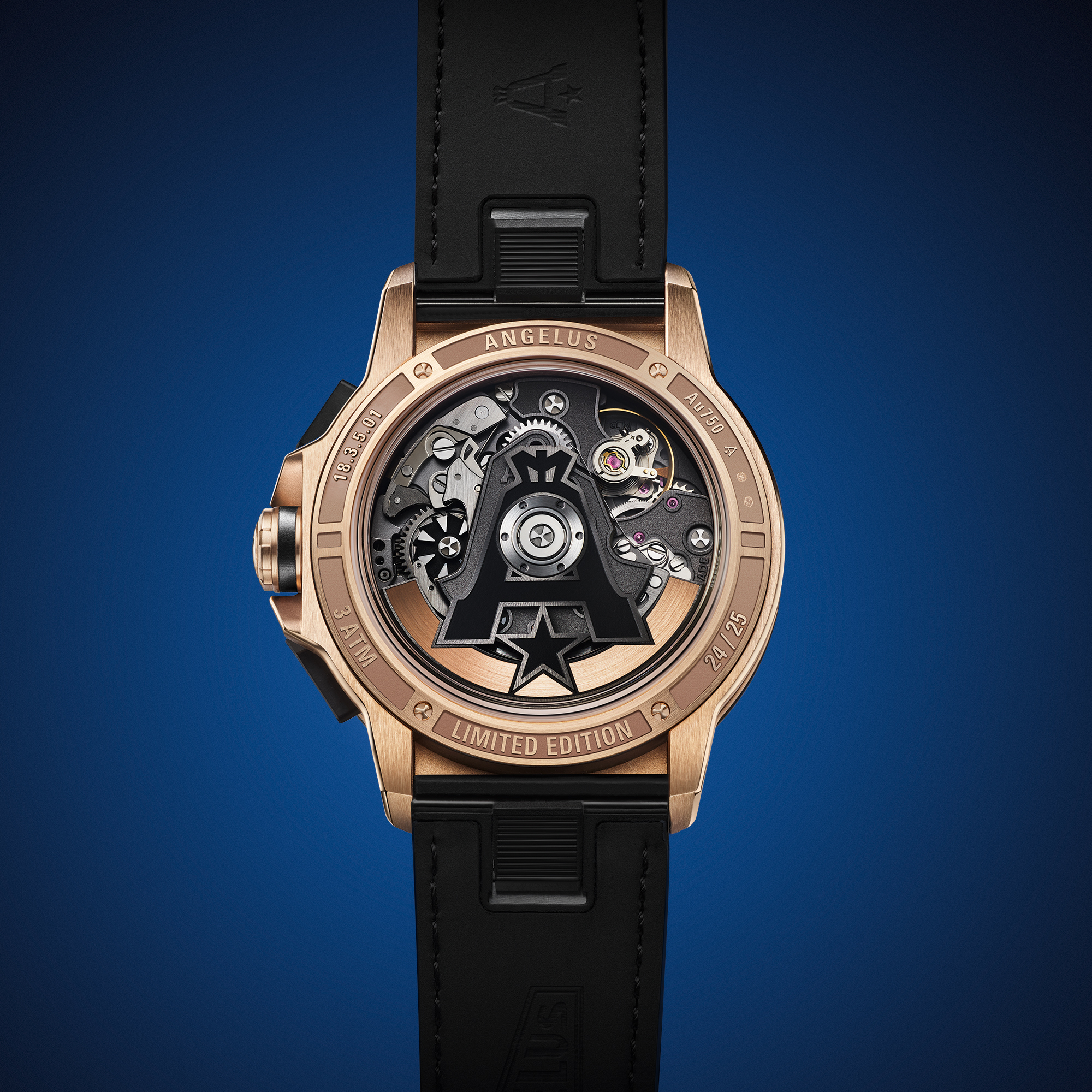 | Dial | blue PVD, frosted centre, gold-coloured applied details coated with white Super-LumiNova emitting a blue glow, black minute track, gold-coloured applied logo |