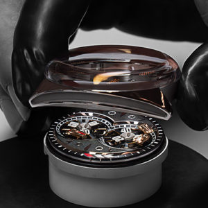 | Crystal | Domed “glass box” sapphire crystal on the dial side; open view case back with sapphire crystal |
