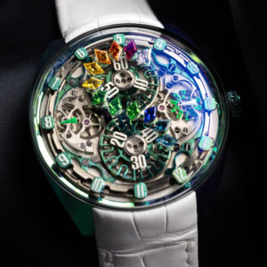 | Crystal | Domed “glass box” sapphire crystal on the dial side; open view case back with sapphire crystal |