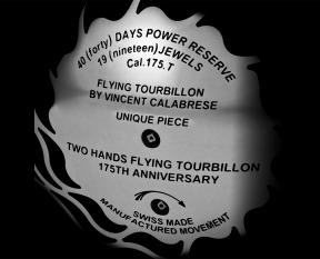 | Complications | Mechanical Timepiece: Hours, Minutes, Flying Tourbillon |